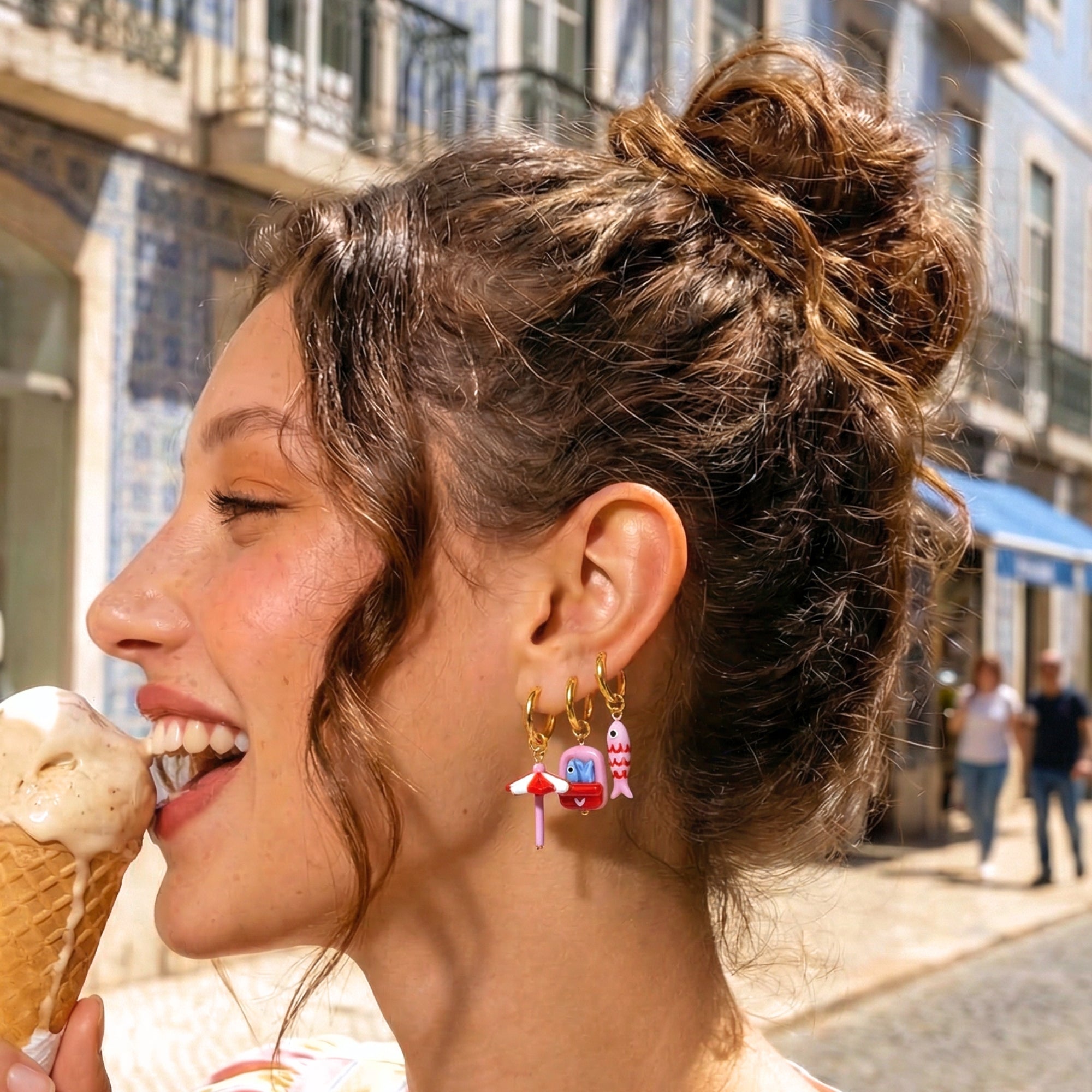 From Luxembourg to Lisbon - and everything in between tastes like summer. For the second Artist Collaboration, Anneday X Pepino dream something up — a collection that smells like pastel de nata, sounds like rooftop terraces in the sun and looks like a market stall in Alfama. Think pink sardines at your ear, a softserve with sprinkles, olives beside your dirty martini.