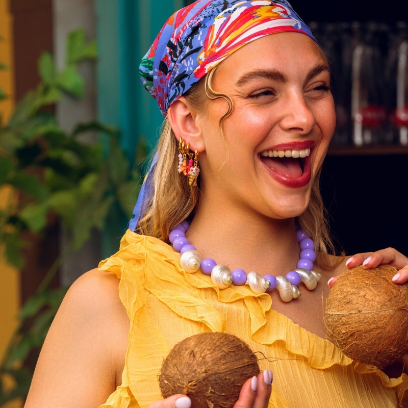 A striking fusion of modern color and natural beauty. This statement piece features glossy lavender acrylic beads paired with Balinese moon snail shells, each carefully selected for their iridescent finish and organic charm. Finished with an 18K gold-plated clasp, this necklace is a wearable work of art that brings a touch of island elegance to your boldest looks.
