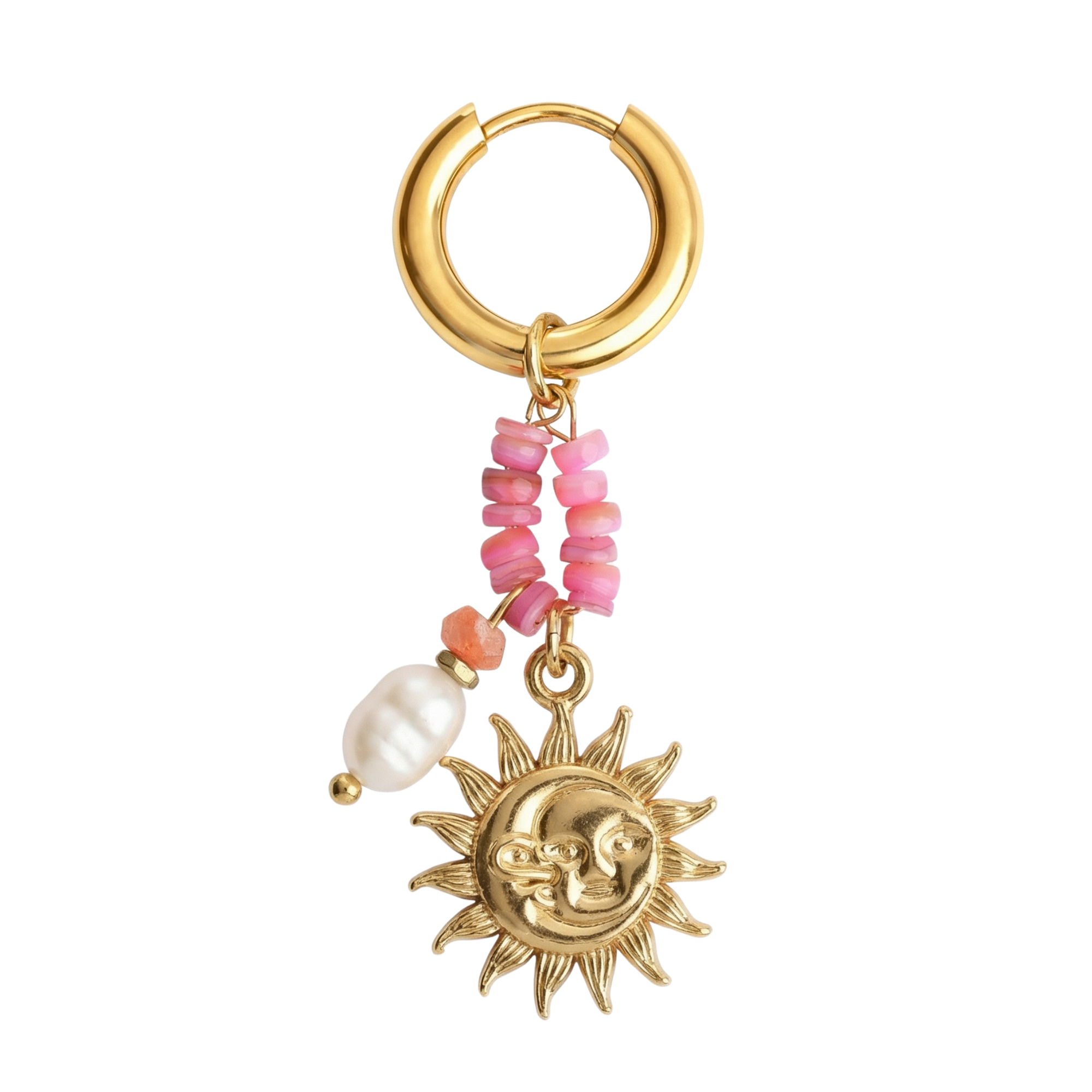 Made for golden hour and the people who chase it. A sun-moon pendant hangs next to a coral bead, a freshwater pearl and natural pink stones in shifting shades - meaning no-one is ever quite the same. From the Island Life collection, for anyone who stays out until the light turns pink.