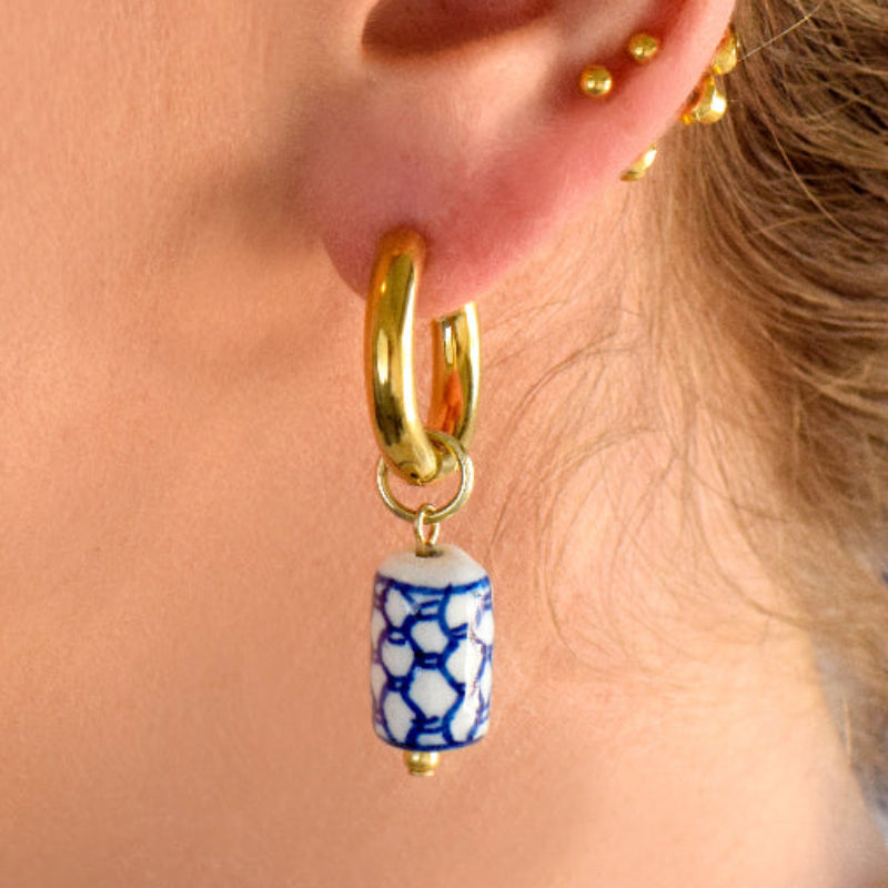 Delfts Blauw Pendant Earring Set is an extraordinary set with cilinder shaped white ceramic pendants with a dark blue string pattern. Create your own moment of wonder when wearing this eye-catching design.